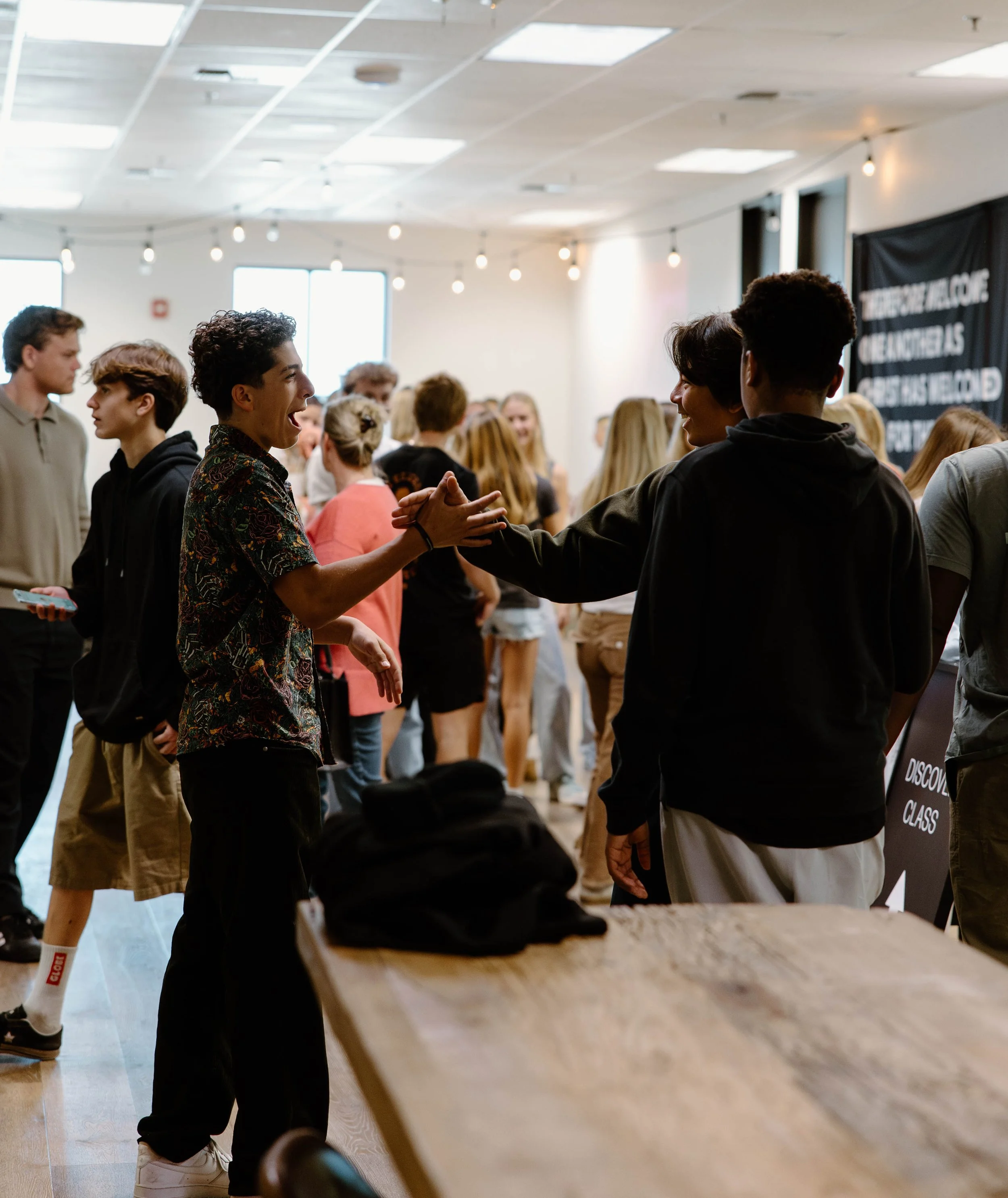 There’s no specific dress code at The Shoreline. We like to call ourselves, “sandy-feet-friendly!” You are welcome to dress however you’re most comfortable! You’ll see everything from “Sunday best” to boardshorts and t-shirts. Kids and students usually wear whatever they would normally wear to school.